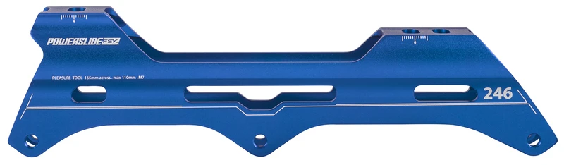 The frame is very well balanced and super stiff. One unique feature of the frame is the variable space between the wheels. The second wheel was shifted a bit more backwards towards the third wheel as this frame was especially designed for speed slalom in order to give the frame more power and stability, because the skaters put more weight on the back of the frame in speedslalom. Sure this frame can also be used for regular skating. The Pleasure Tool frame is 246mm long fitting max. 3x 110mm wheels. The frame got his extraordinary look from the CNC milled edges including the perfect laser prints. A special detail are the scales along the side of the mounting slots, but also placed on front and rear to help the skater to adjust his frame-boot set up.
