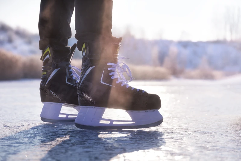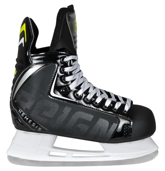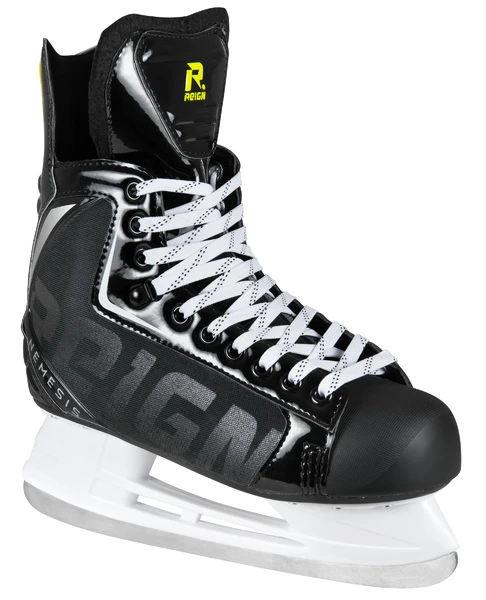 Der Reign Nemesis ist ein perfekter Eishockey-Skate für Anfänger und Fortgeschrittene. Der Skate ist im Schaftbereich sehr stabil und stützend aufgebaut, das hochwertige und abriebfeste Nylon-Obermaterial und das Design geben dem Nemesis einen tollen Look. Die Zehenkappe besteht aus schlagfestem Polyethylen. Die gewachsten Schnürsenkel, zusammen mit den Ösen und dem 45°-Grad-Verschluss umschließen den Fuß perfekt, geben ihm Halt und dennoch genügend Bewegungsfreiheit. Die hochwertig verarbeitete Zunge mit Aufprallschutz, sorgt für eine komfortable Passform. Dank der Kufe aus rostfreiem Stahl und dem Kufenhalter aus einem Nylon-Verbundmaterial, erlebst du absoluten Fahrspaß. Die Außensohle ist dünn und flach konzipiert, um den Schwerpunkt niedrig zu halten. Mit dem Reign Nemesis bist du jederzeit, für jedes Spiel bereit.